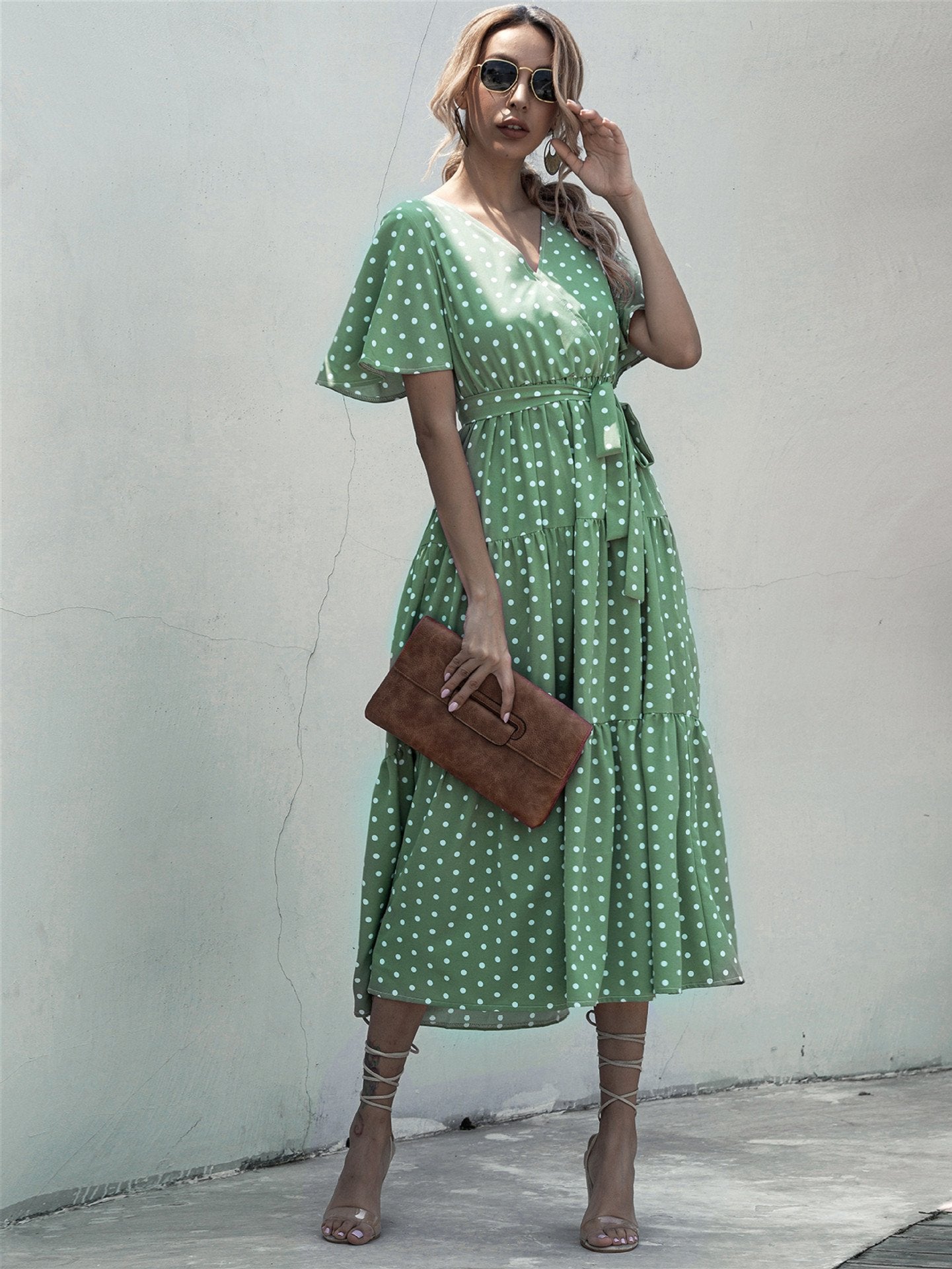 Dot Print V Neck Women Boho Style Summer Beach Long Dress