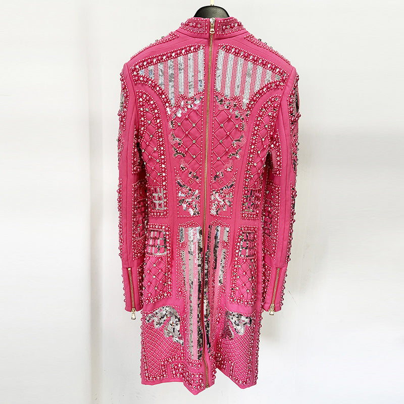 This stunning bodycon dress is perfect for any fashionable occasion. Made from a blend of cotton and polyester, it offers a comfortable fit with great elasticity. The dress features a stylish stand collar and long sleeves, making it suitable for both casual and semi-formal wear. The beautiful sequin detailing adds a touch of glamour, making you stand out at parties or events. Available in classic pink and black colors, it's a versatile addition to your wardrobe.