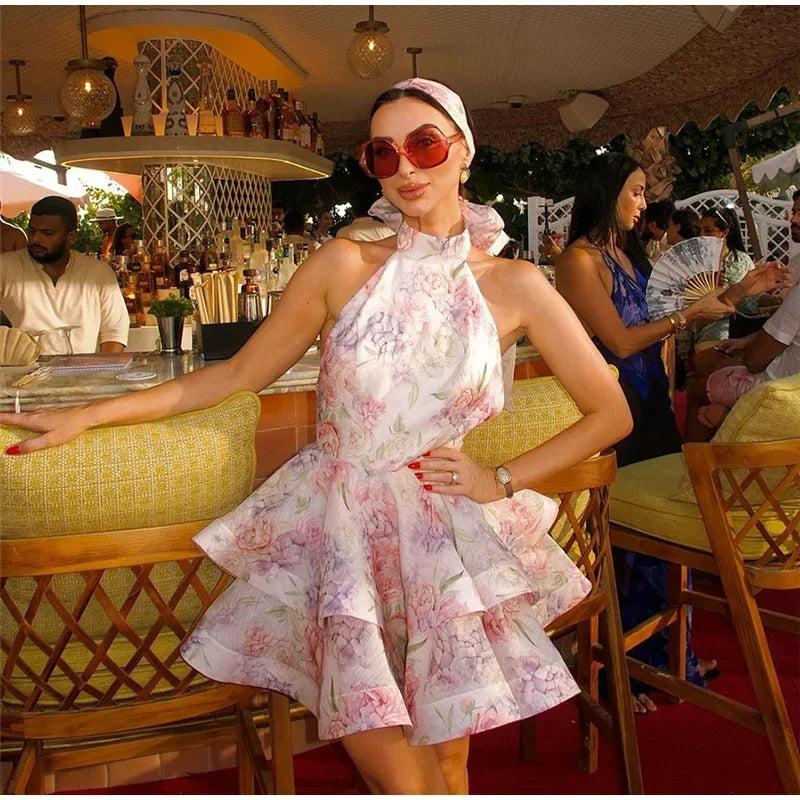 Floral Print Halter Ruffles Dresses Women's Elegant Backless Sleeveless Bow Lace Up Mini Dress 2025 Summer New Lady Party Robes